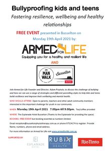 The Man Walk Group Busselton are supporting a free event on 19th April 2021 in partnership with the Armed for Life and supported by The Esplanade Hotel Busselton, RUBIX Health and Rio Tinto.